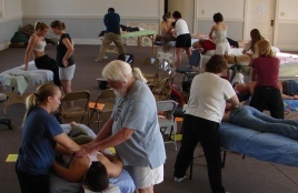 NOTE: It is very important that you come to the MFR sessions prepared to work in "skin accessible" clothing, so that we don't have to work under sheets. Shorts and a light top work well as long as they are loose fitting. Lumch will be on your own - local restaurants or brown bag. Tables are provided by the massage school. It's helpful if you can bring a fitted sheet and a face-cradle coner.